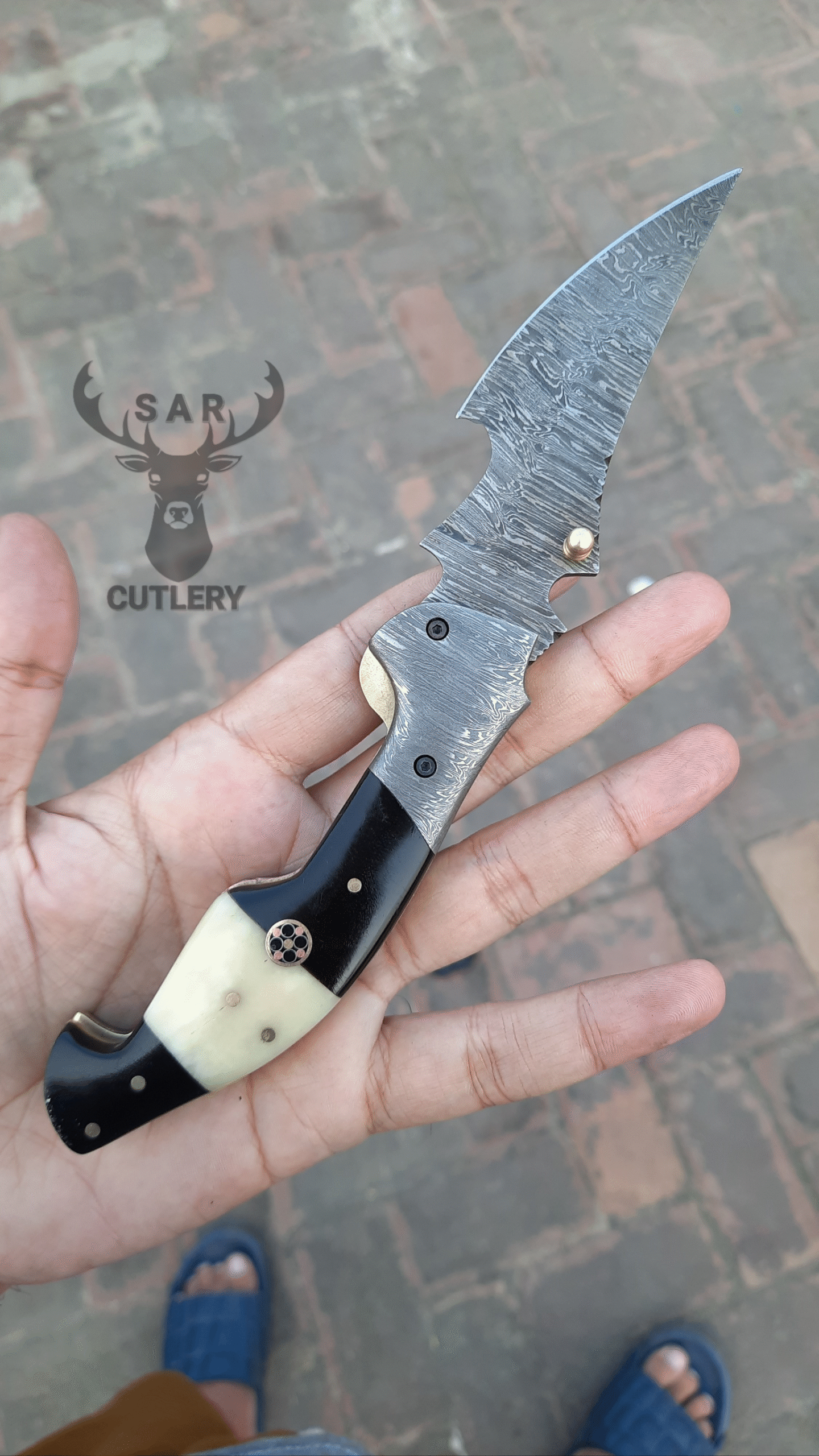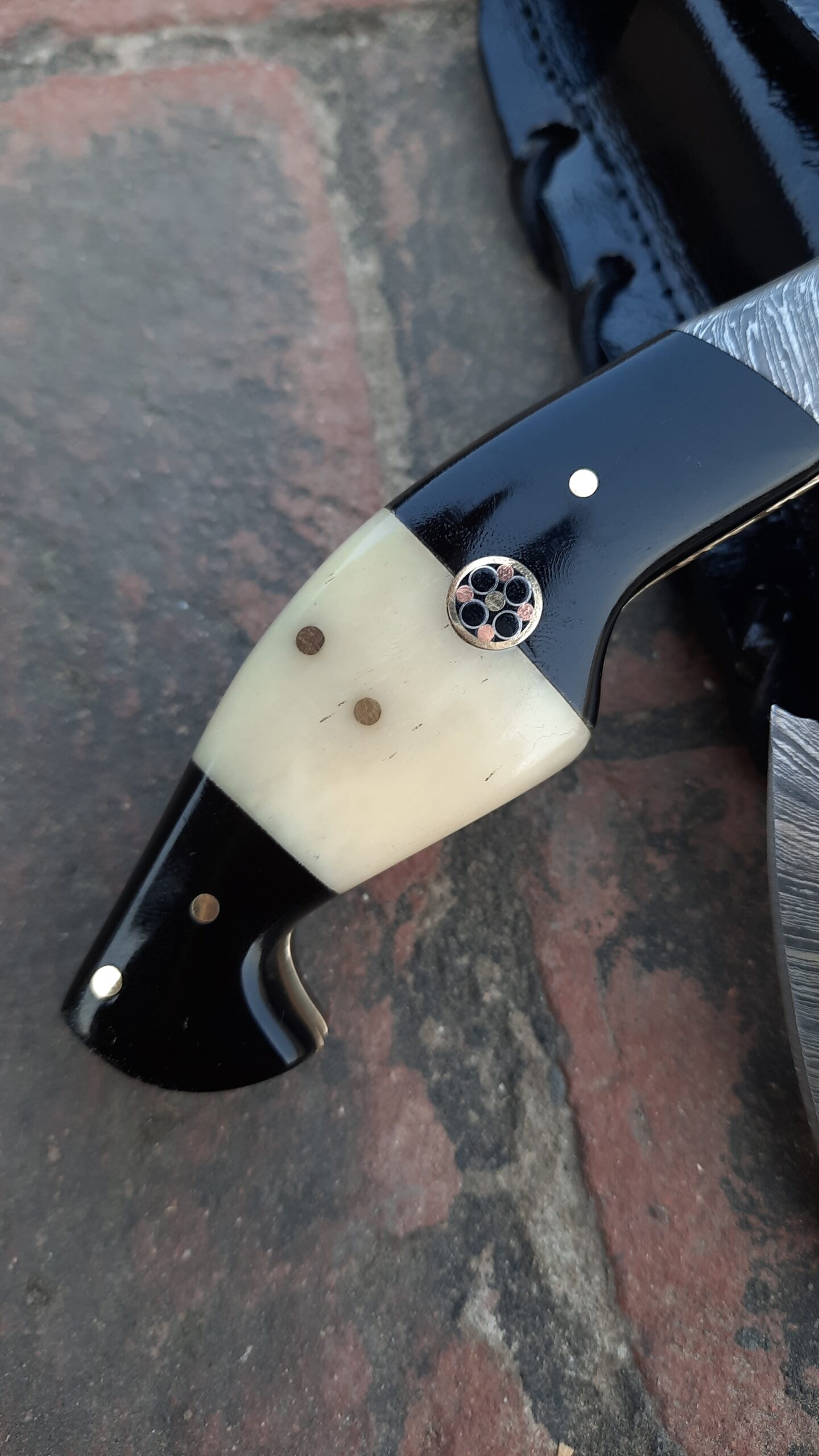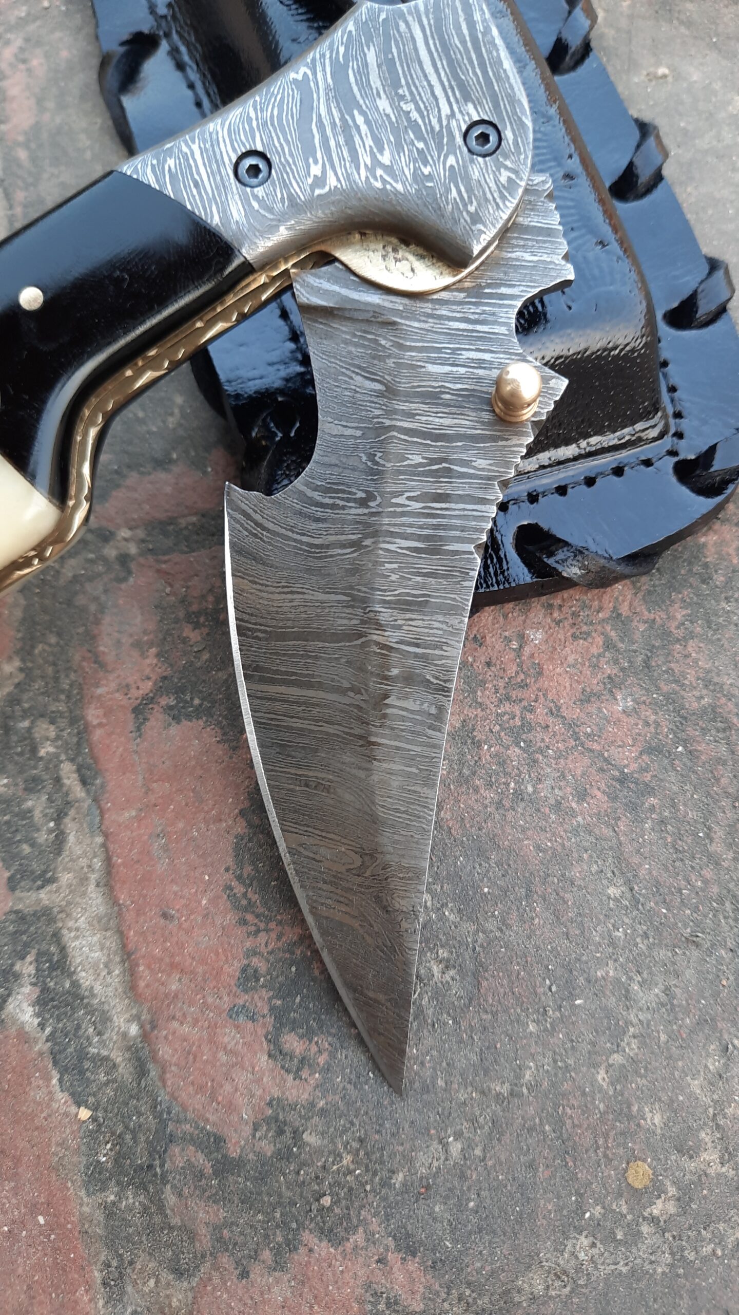 It features a Damascus steel blade, brass file work on the rear, and a buffalo horn & bone handle.